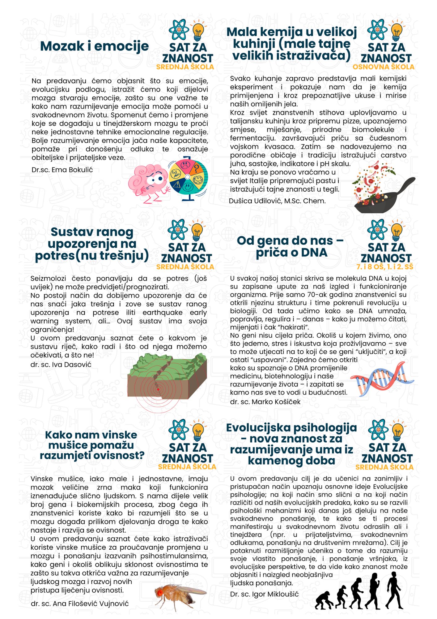 Povodom Svjetskog dana znanosti (10. studenoga), naše članice Centra Ana Filošević Vujnović i Vedrana Mikulić Crnkovićsu se uključile u manifestaciju Sat za znanost i održale online predavanje “Kako nam vinske mušice pomažu razumjeti ovisnost” i online radionicu “Crtajmo matematikom”.