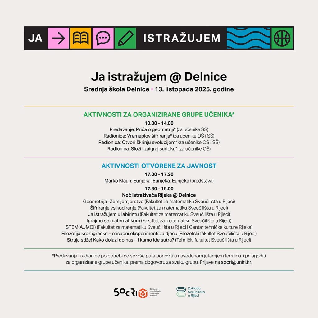 Naša postaja nudi interaktivno filozofsko predavanje za djecu temeljeno na tri klasična misaona eksperimenta — Problem tramvaja, Tezejev brod i Gigov prsten. Svaki eksperiment bit će predstavljen kroz kratko izlaganje i otvorenu raspravu u kojoj će učenici promišljati o moralnim dilemama, identitetu i pravednosti. Cilj aktivnosti je potaknuti kritičko mišljenje, razviti vještine argumentacije i pokazati kako filozofija pomaže razumjeti složena pitanja svakodnevnog života. Aktivnost vode dr. sc. David Grčki, (suradnici dr. sc. Vito Balorda, prof. dr. sc. Luca Malatesti) s Odsjeka za filozofiju u Rijeci.